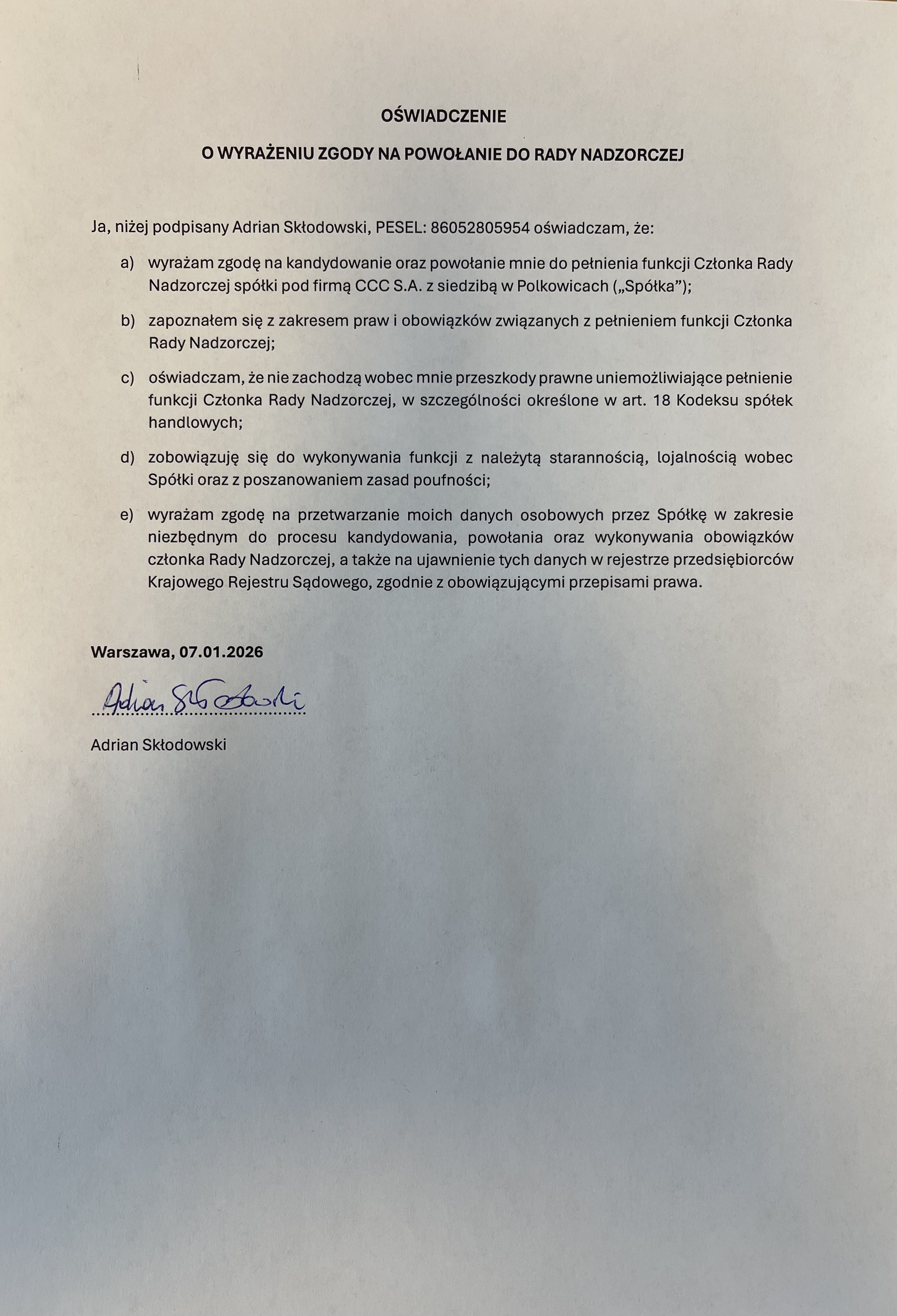 Zarząd CCC S.A. z siedzibą w Polkowicach (dalej: „Spółka”), w związku ze zwołanym na dzień 15 stycznia 2026 roku, Nadzwyczajnym Walnym Zgromadzeniem Akcjonariuszy, informuje, że otrzymał zawiadomienie od Akcjonariusza VALUE Funduszu Inwestycyjnego Zamkniętego z wydzielonym Subfunduszem 1 z siedzibą w Warszawie, o zgłoszeniu kandydatury Pana Adriana Skłodowskiego na członka Rady Nadzorczej Spółki.